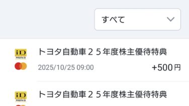 2025年度からトヨタ自動車の株主優待制度がはじまった。保有株100株で500円分の電子マネー(QUICPayまたはiD)を受け取る。「TOYOTA Wallet」というアプリをインストールして、受け取る。ネットでは、QUICPayで受け取...