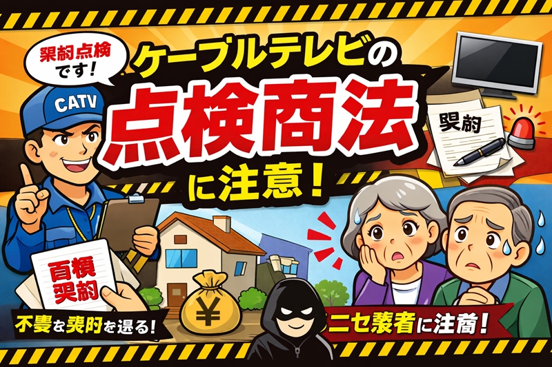 ケーブルテレビの点検商法とは、「設備点検」「無料メンテナンス」などを理由に家に上がり込み、不要な契約や高額なサービスを契約させる営業手法のことです。